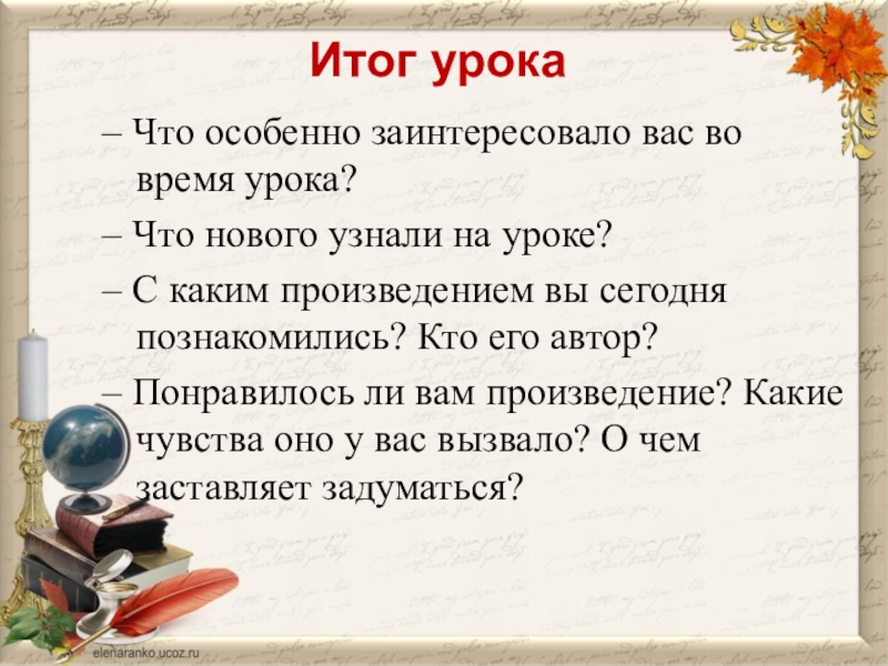 Итог урока – Что особенно заинтересовало вас во время урока?– Что нового узнали на уроке?– С каким