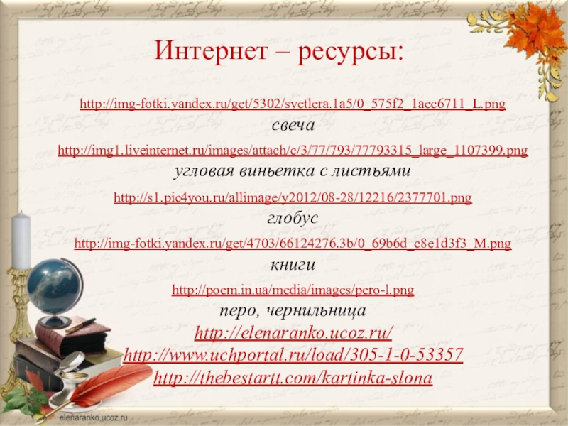 Интернет – ресурсы:http://img-fotki.yandex.ru/get/5302/svetlera.1a5/0_575f2_1aec6711_L.png свечаhttp://img1.liveinternet.ru/images/attach/c/3/77/793/77793315_large_1107399.pngугловая виньетка с листьямиhttp://s1.pic4you.ru/allimage/y2012/08-28/12216/2377701.png  глобусhttp://img-fotki.yandex.ru/get/4703/66124276.3b/0_69b6d_c8e1d3f3_M.png книгиhttp://poem.in.ua/media/images/pero-l.png перо, чернильницаhttp://elenaranko.ucoz.ru/http://www.uchportal.ru/load/305-1-0-53357http://thebestartt.com/kartinka-slona