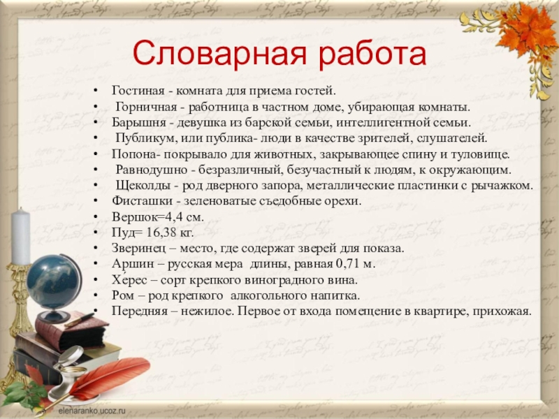 Словарная работаГостиная - комната для приема гостей. Горничная - работница в частном доме, убирающая комнаты.Барышня - девушка из