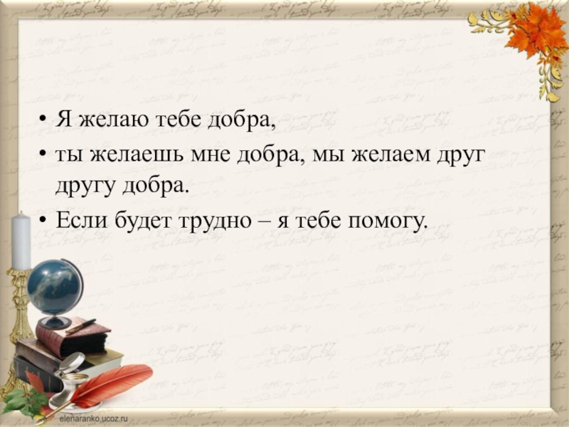 Я желаю тебе добра, ты желаешь мне добра, мы желаем друг другу добра. Если будет трудно – я тебе помогу.