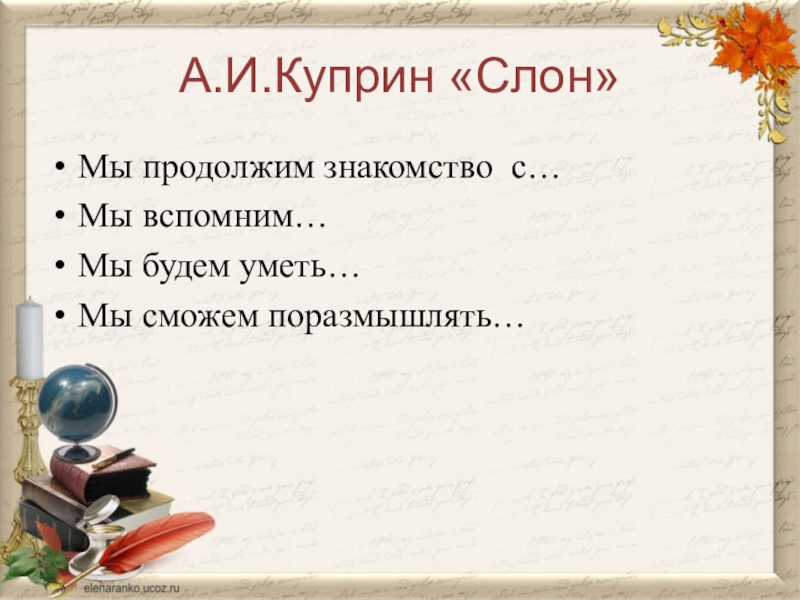 А.И.Куприн «Слон»Мы продолжим знакомство с…Мы вспомним…Мы будем уметь…Мы сможем поразмышлять…