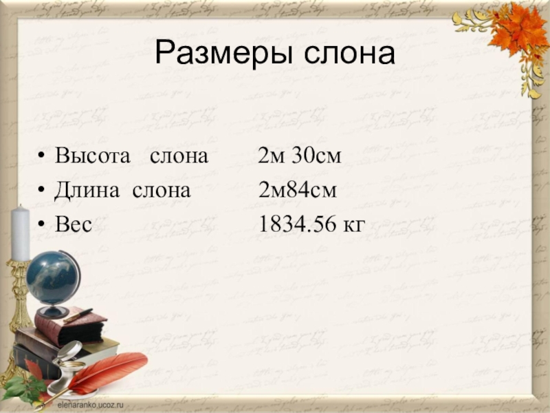 Размеры слонаВысота   слона    2м 30смДлина  слона      2м84смВес