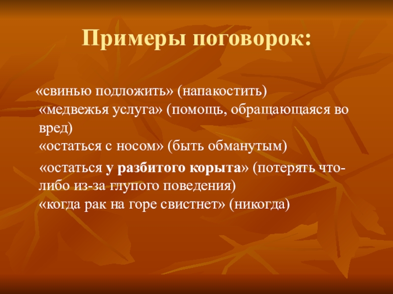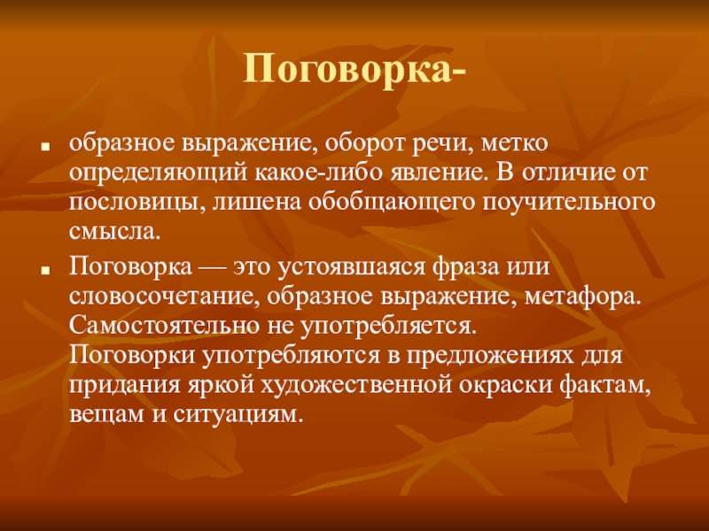 Поговорки употребляются в предложениях для придания яркой художественной окраски фактам, вещам и ситуациям.