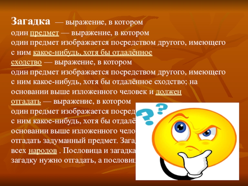 ним какое-нибудь, хотя бы отдалённое сходство — выражение, в котором один предмет изображается посредством другого, имеющего с ним какое-нибудь, хотя бы отдалённое сходство; на основании выше изложенного человек и должен отгадать — выражение, в котором один предмет изображается посредством другого, имеющего с ним какое-нибудь, хотя бы отдалённое сходство; на основании выше изложенного человек и должен отгадать задуманный предмет. Загадки встречаются у всех народов . Пословица и загадка отличаются тем, что загадку нужно отгадать, а пословица — это поучение.