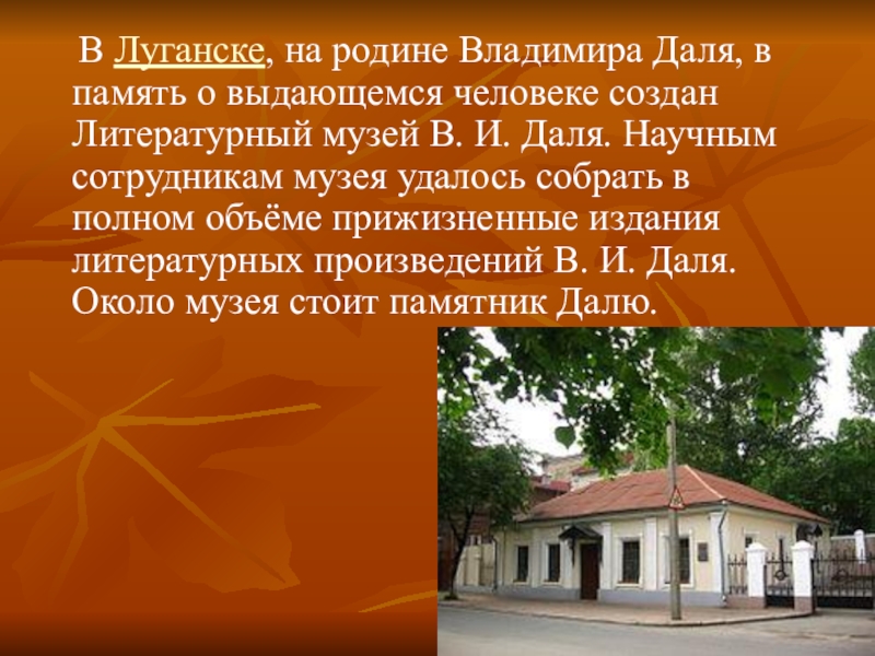 Слайд 4 В Луганске, на родине Владимира Даля, в память о выдающемся
