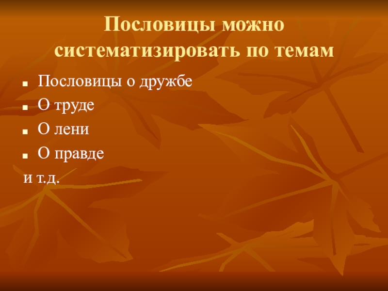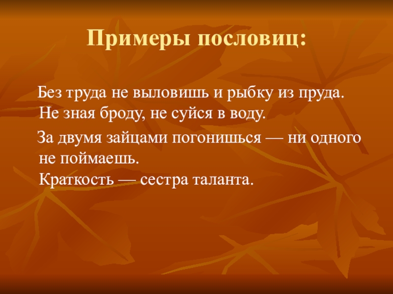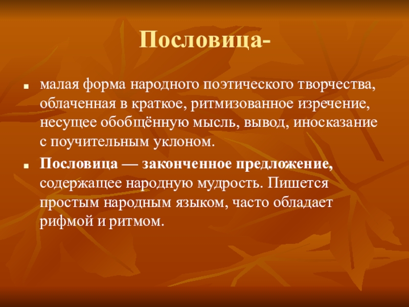 Пословица — законченное предложение, содержащее народную мудрость. Пишется простым народным языком, часто обладает рифмой и ритмом.
