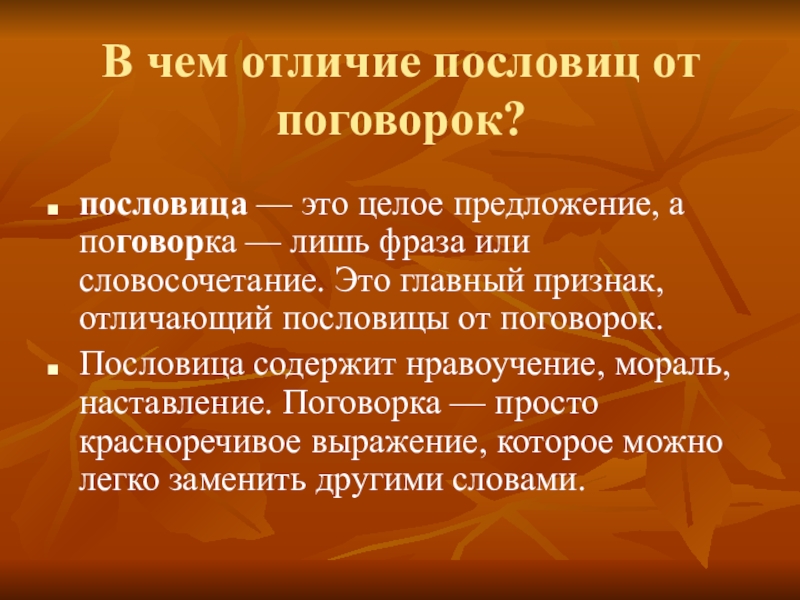 лишь фраза или словосочетание. Это главный признак, отличающий пословицы от поговорок.