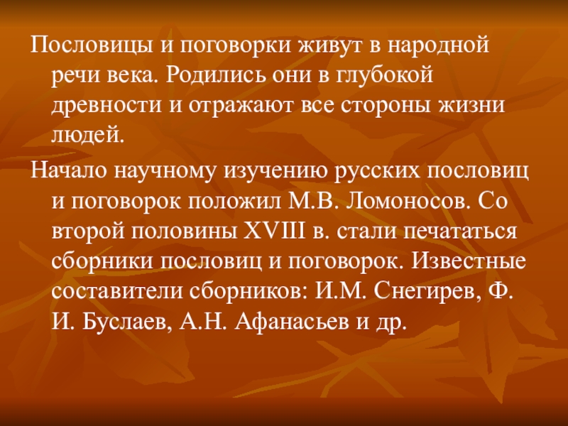 Начало научному изучению русских пословиц и поговорок положил М.В. Ломоносов. Со второй половины XVIII в. стали печататься сборники пословиц и поговорок. Известные составители сборников: И.М. Снегирев, Ф.И. Буслаев, А.Н. Афанасьев и др.