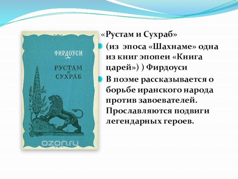 «Рустам и Сухраб» (из эпоса «Шахнаме» одна из книг эпопеи «Книга царей») ) ФирдоусиВ поэме рассказывается