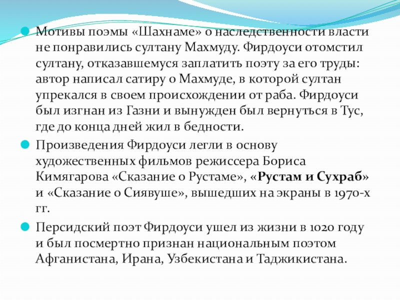 Слайд 3Мотивы поэмы «Шахнаме» о наследственности власти не понравились султану Махмуду. Фирдоуси отомстил султану,