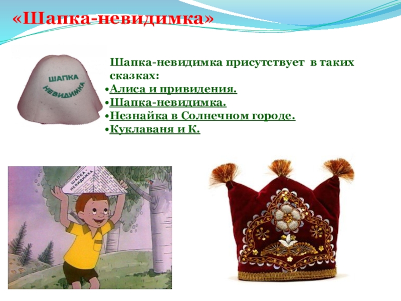 «Шапка-невидимка»Шапка-невидимка присутствует в таких сказках:Алиса и привидения.Шапка-невидимка.Незнайка в Солнечном городе.Куклаваня и К.