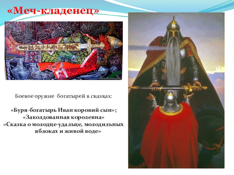 «Меч-кладенец»Боевое оружие богатырей в сказках:«Буря-богатырь Иван коровий сын»;«Заколдованная королевна»«Сказка о молодце-удальце, молодильных яблоках и живой воде»