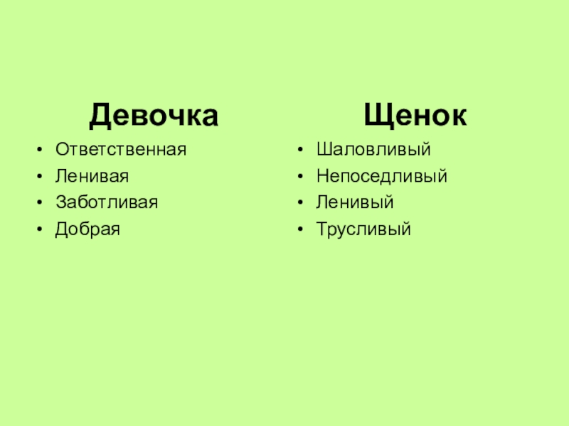 Девочка Ответственная Ленивая Заботливая Добрая Щенок Шаловливый Непоседливый Ленивый Трусливый