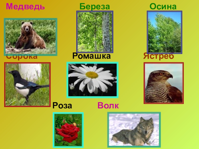 Медведь Береза Осина Сорока Ромашка Ястреб