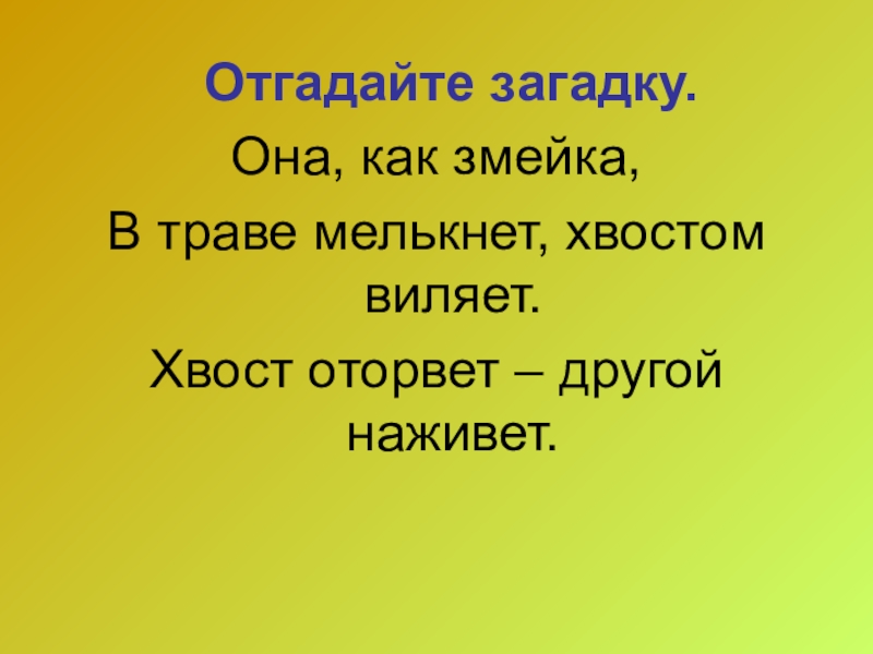 Отгадайте загадку.Она, как змейка,В траве мелькнет, хвостом виляет.Хвост оторвет – другой наживет.