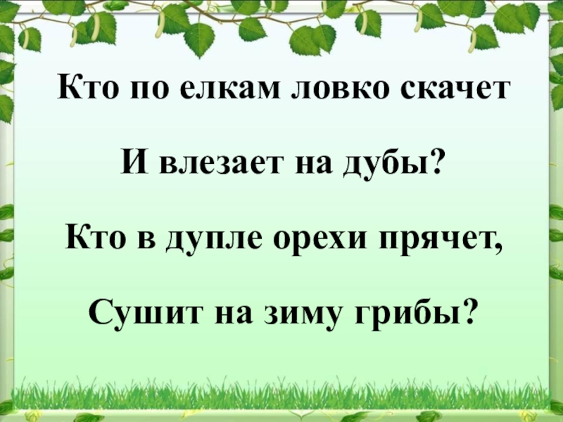 Кто по елкам ловко скачетИ влезает на дубы?Кто в дупле орехи прячет,Сушит на зиму грибы?
