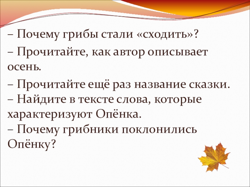 – Почему грибы стали «сходить»?– Прочитайте, как автор описывает осень.– Прочитайте ещё раз название сказки. – Найдите