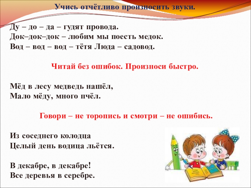Учись отчётливо произносить звуки.Ду – до – да – гудят провода.Док–док–док – любим мы поесть медок.Вод –