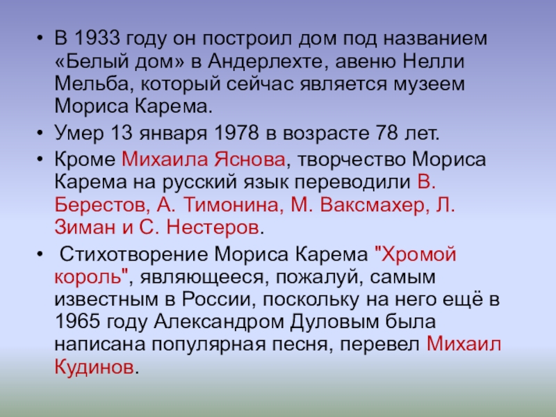 Стихотворение Мориса Карема "Хромой король", являющееся, пожалуй, самым известным в России, поскольку на него ещё в 1965 году Александром Дуловым была написана популярная песня, перевел Михаил Кудинов.