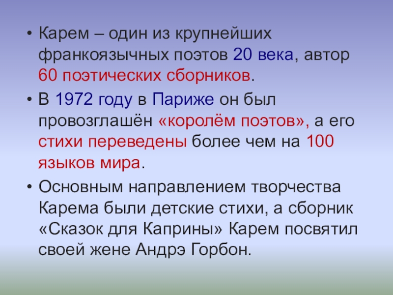 Слайд 4Карем – один из крупнейших франкоязычных поэтов 20 века, автор 60 поэтических