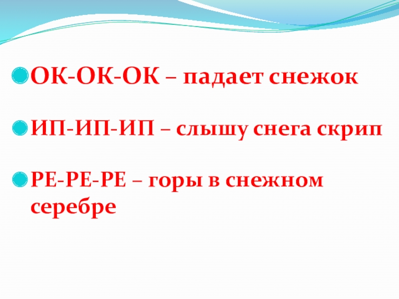 ОК-ОК-ОК – падает снежокИП-ИП-ИП – слышу снега скрипРЕ-РЕ-РЕ – горы в снежном серебре