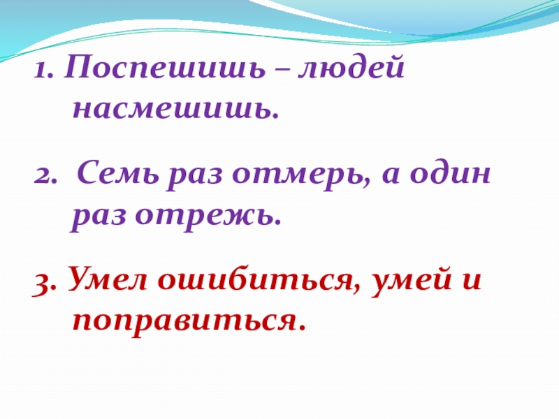 1. Поспешишь – людей насмешишь.2. Семь раз отмерь, а один раз отрежь.3. Умел ошибиться, умей и поправиться.