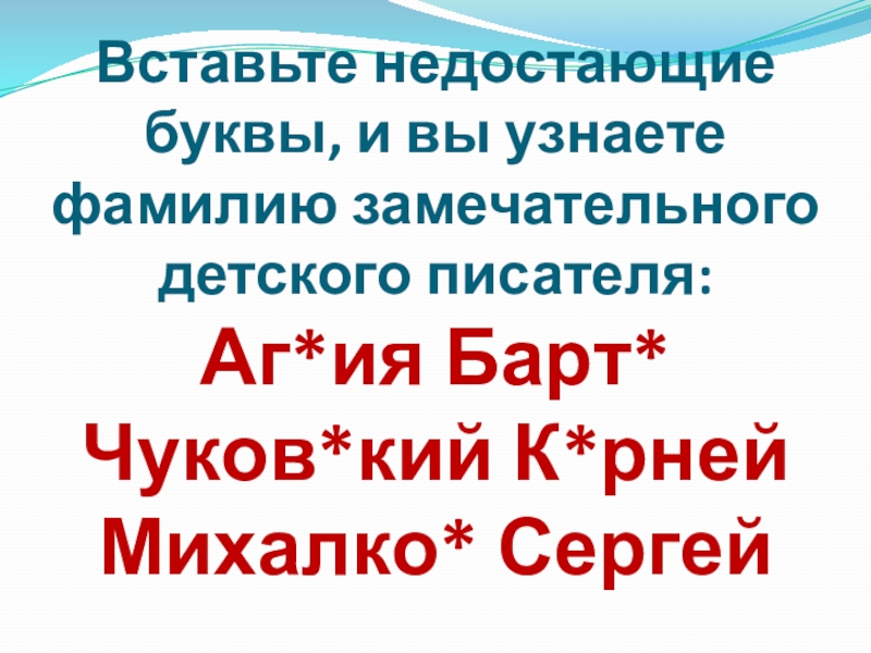 Слайд 8Вставьте недостающие буквы, и вы узнаете фамилию замечательного детского писателя: Аг*ия Барт* Чуков*кий