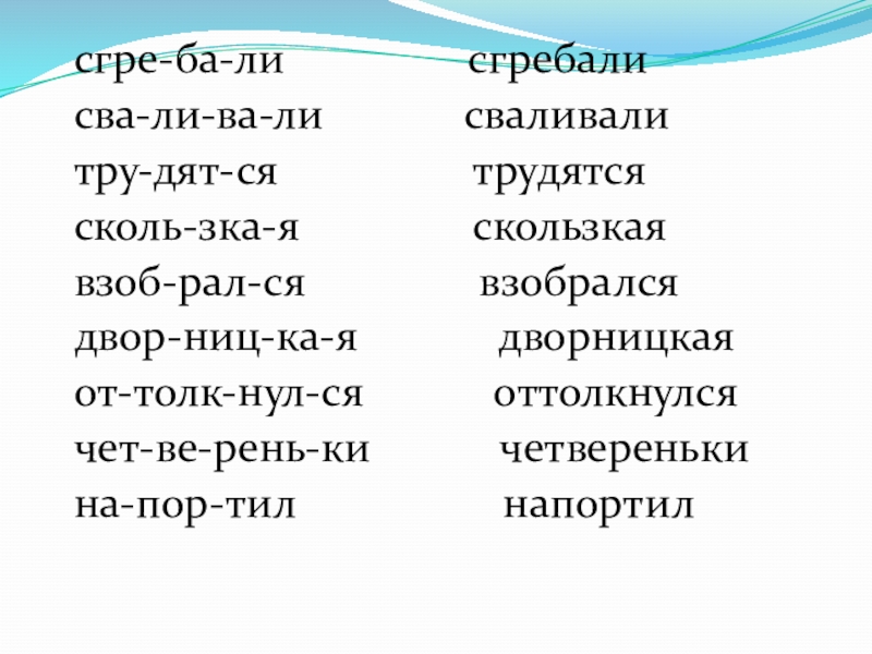 сгре-ба-ли         сгребалисва-ли-ва-ли       сваливалитру-дят-ся