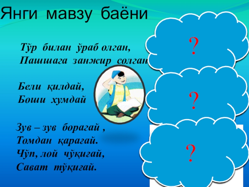 Кўргазмалари: Интерактив доска,тўплаштириш стратегияси, беш мисрали шеър стратегияси, симантик карта.