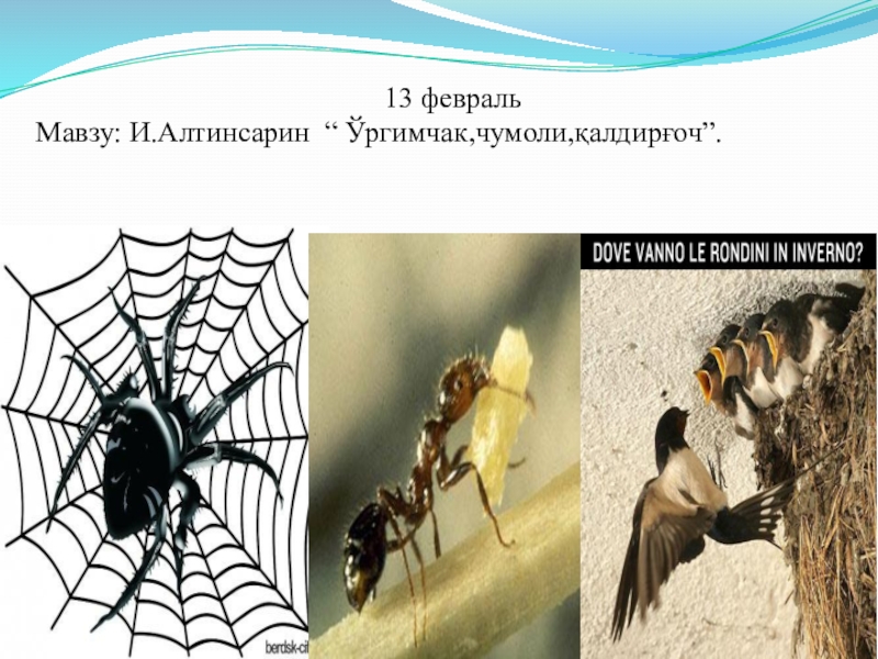 а) Ўқувчиларга И.Алтинсариннинг “Ўргимчак,чумоли, қалдирғоч” матнининг мазмунини тушунтириш,уларнинг онгига сингдириш. Ифодали ва равон ўқишга ўргатиш.