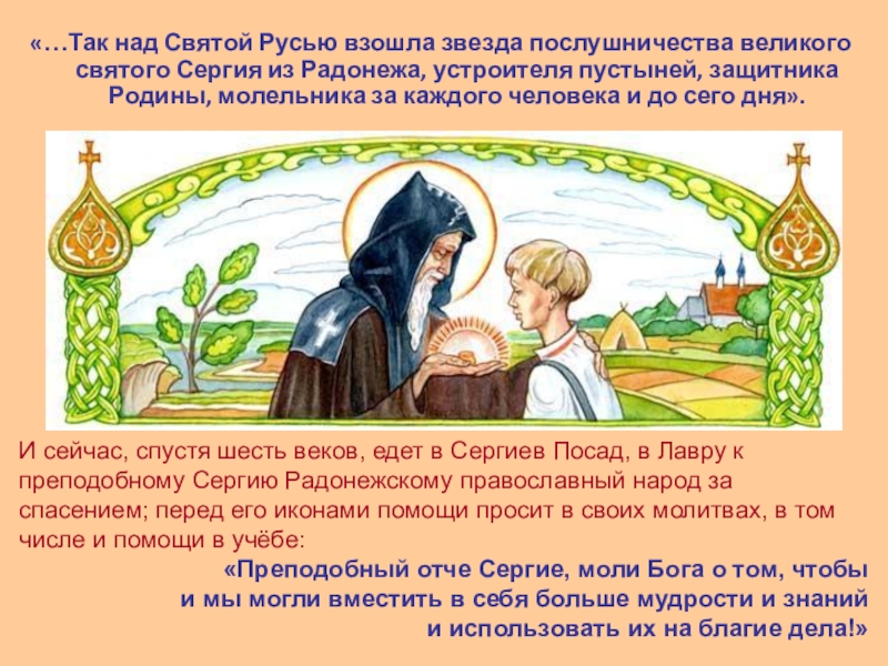 И сейчас, спустя шесть веков, едет в Сергиев Посад, в Лавру к преподобному Сергию Радонежскому православный народ за спасением; перед его иконами помощи просит в своих молитвах, в том числе и помощи в учёбе: