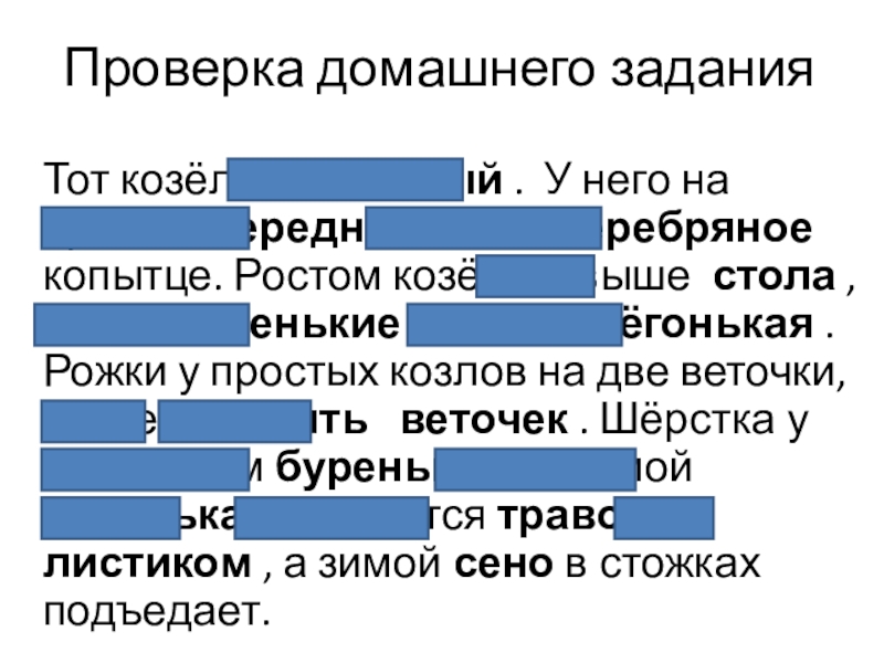 Проверка домашнего заданияТот козёл особенный . У него на правой передней  ноге серебряное копытце. Ростом козёл
