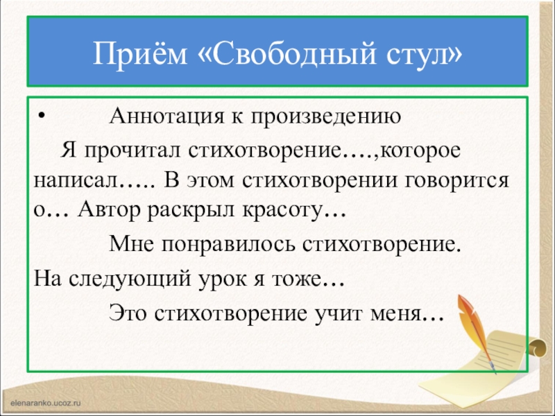 Приём «Свободный стул»    Аннотация к произведению  Я прочитал стихотворение….,которое написал….. В этом стихотворении