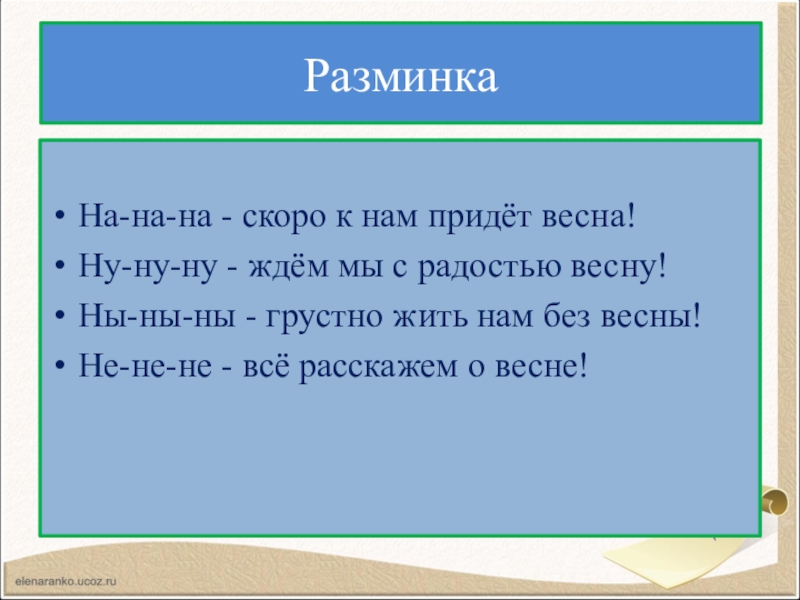 РазминкаНа-на-на - скоро к нам придёт весна!Ну-ну-ну - ждём мы с радостью весну!Ны-ны-ны - грустно жить нам без весны!Не-не-не - всё расскажем о весне!