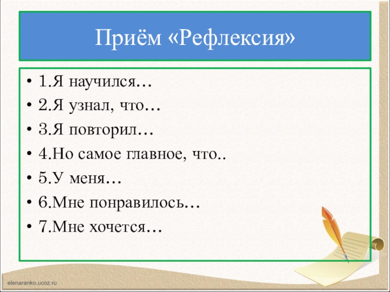 Приём «Рефлексия»1.Я научился…2.Я узнал, что…3.Я повторил…4.Но самое главное, что..5.У меня…6.Мне понравилось…7.Мне хочется…