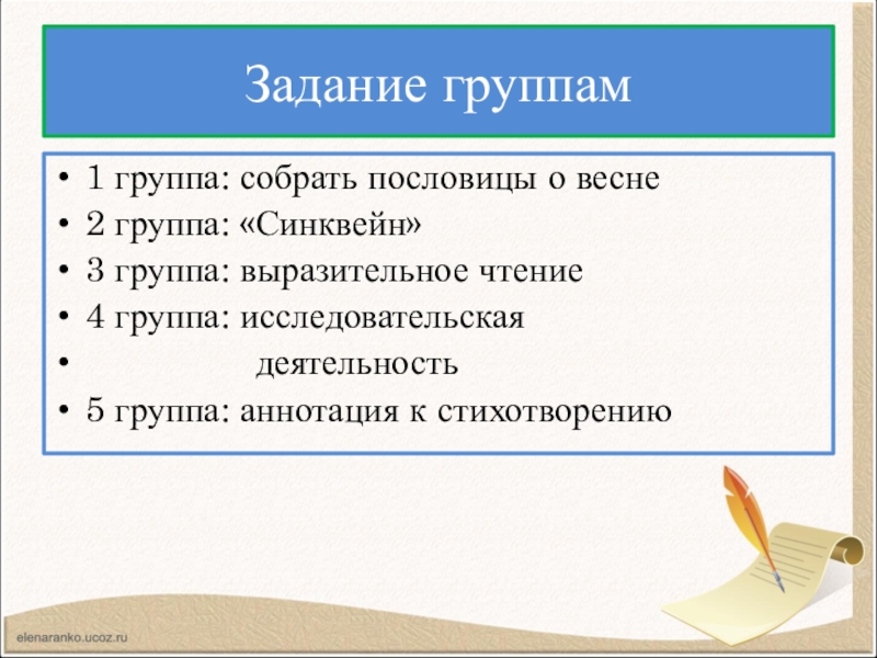 Задание группам1 группа: собрать пословицы о весне2 группа: «Синквейн» 3 группа: выразительное чтение4 группа: исследовательская
