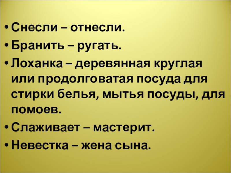 Снесли – отнесли.Бранить – ругать.Лоханка – деревянная круглая или продолговатая посуда для стирки белья, мытья посуды, для