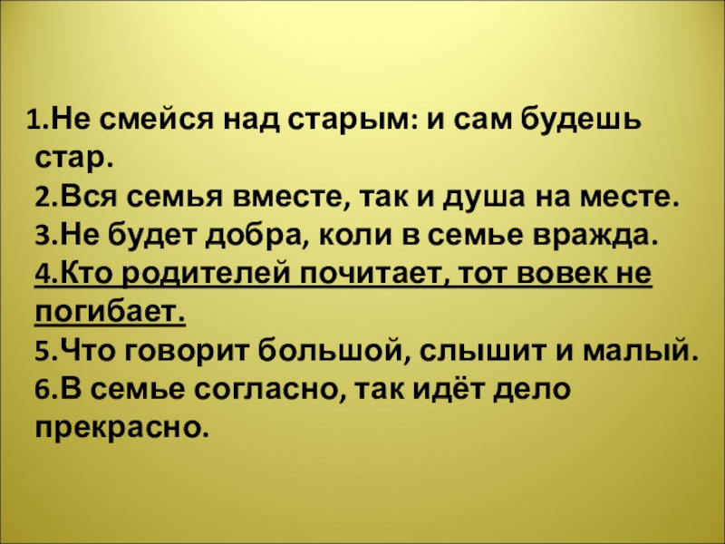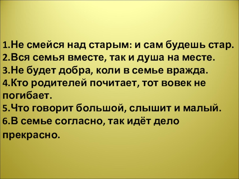 и душа на месте. 3.Не будет добра, коли в семье вражда. 4.Кто родителей почитает, тот вовек не погибает. 5.Что говорит большой, слышит и малый. 6.В семье согласно, так идёт дело прекрасно.