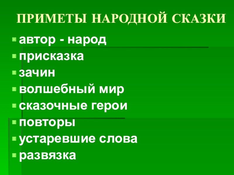 ПРИМЕТЫ НАРОДНОЙ СКАЗКИавтор - народприсказказачинволшебный мирсказочные героиповторыустаревшие словаразвязка