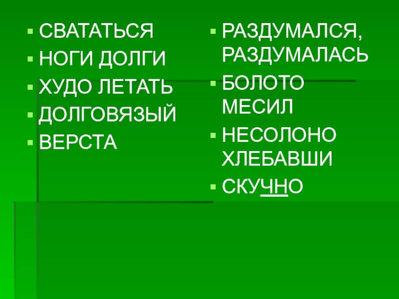 СВАТАТЬСЯНОГИ ДОЛГИХУДО ЛЕТАТЬДОЛГОВЯЗЫЙВЕРСТАРАЗДУМАЛСЯ, РАЗДУМАЛАСЬБОЛОТО МЕСИЛНЕСОЛОНО ХЛЕБАВШИСКУЧНО