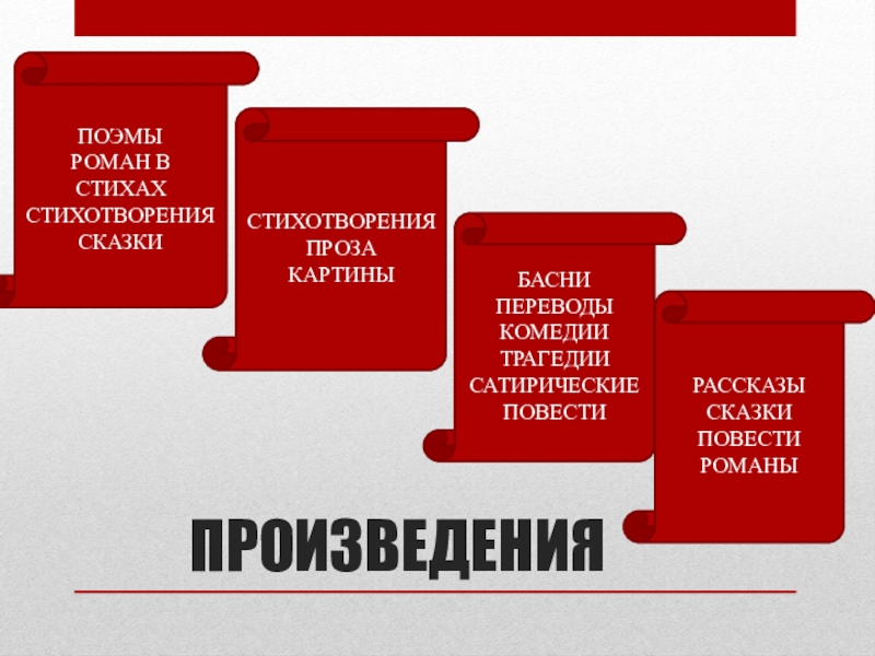 ПРОИЗВЕДЕНИЯПОЭМЫРОМАН В СТИХАХ СТИХОТВОРЕНИЯСКАЗКИСТИХОТВОРЕНИЯПРОЗАКАРТИНЫБАСНИПЕРЕВОДЫКОМЕДИИТРАГЕДИИСАТИРИЧЕСКИЕ ПОВЕСТИРАССКАЗЫСКАЗКИПОВЕСТИРОМАНЫ