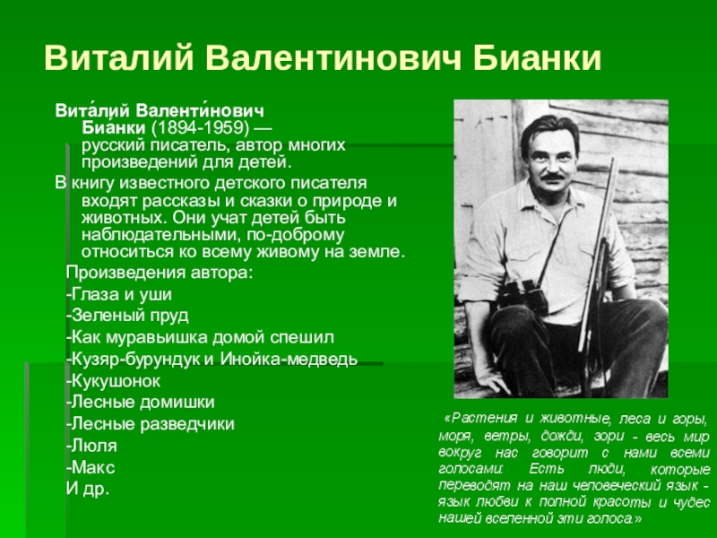 «Растения и животные, леса и горы, моря, ветры, дожди, зори - весь мир вокруг нас говорит с нами всеми голосами: Есть люди, которые переводят на наш человеческий язык - язык любви к полной красоты и чудес нашей вселенной эти голоса.»