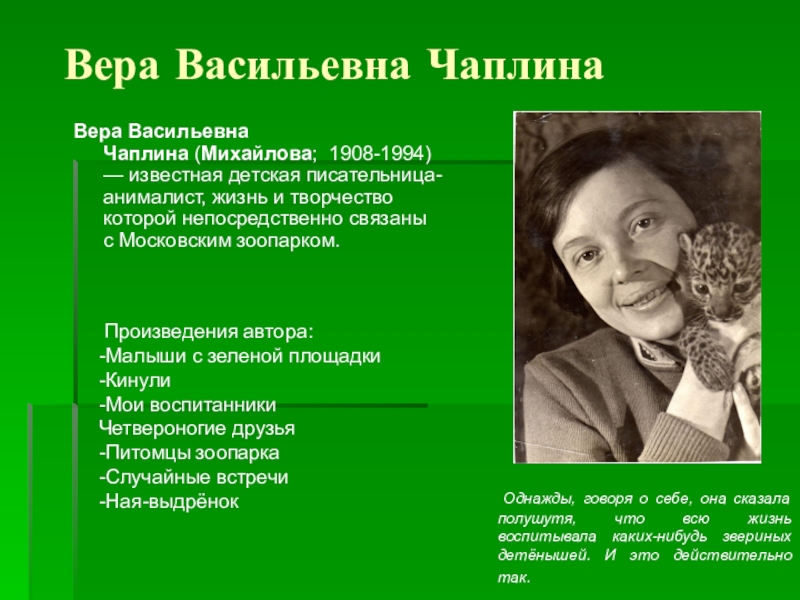 Однажды, говоря о себе, она сказала полушутя, что всю жизнь воспитывала каких-нибудь звериных детёнышей. И это действительно так.