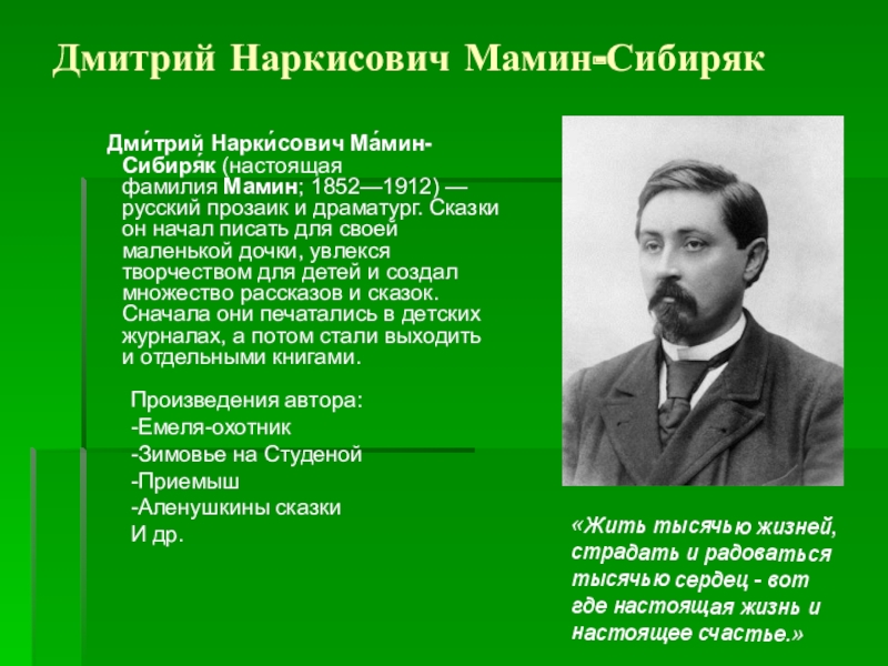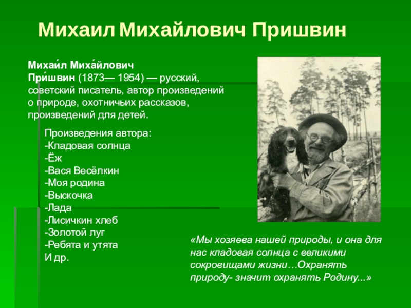 Михаи́л Миха́йлович При́швин (1873— 1954) — русский, советский писатель, автор произведений о природе, охотничьих рассказов, произведений для детей.