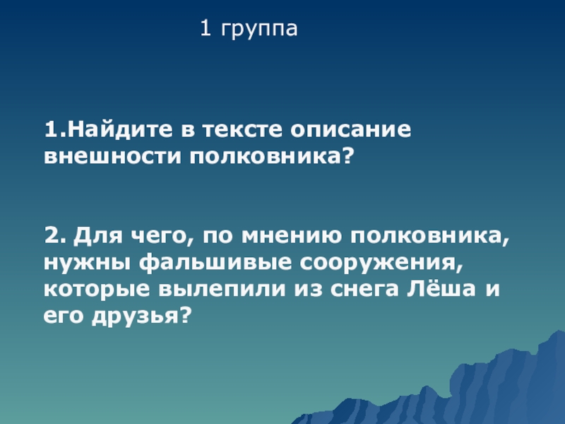 1 группа1.Найдите в тексте описание внешности полковника?2. Для чего, по мнению полковника, нужны фальшивые сооружения, которые вылепили