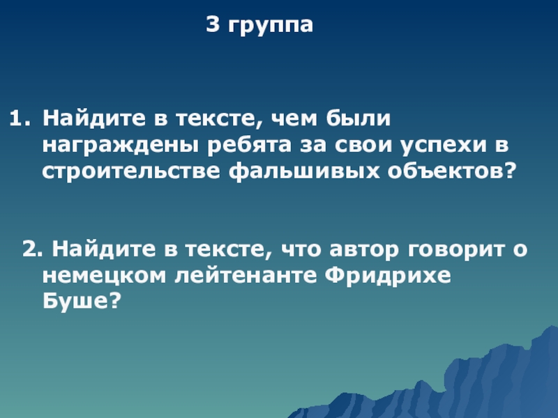 3 группаНайдите в тексте, чем были награждены ребята за свои успехи в строительстве фальшивых объектов?2. Найдите в
