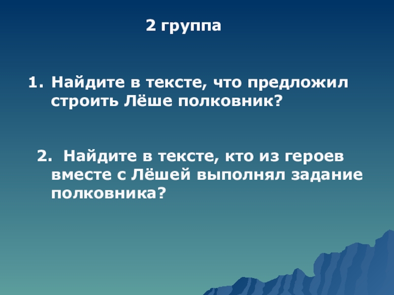 2 группаНайдите в тексте, что предложил строить Лёше полковник?2. Найдите в тексте, кто из героев вместе с
