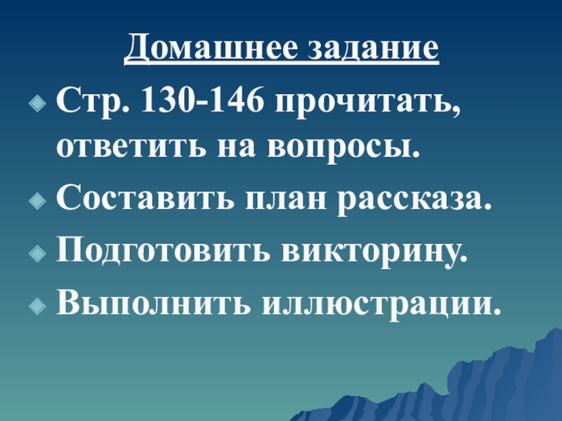 Домашнее заданиеСтр. 130-146 прочитать, ответить на вопросы.Составить план рассказа.Подготовить викторину.Выполнить иллюстрации.
