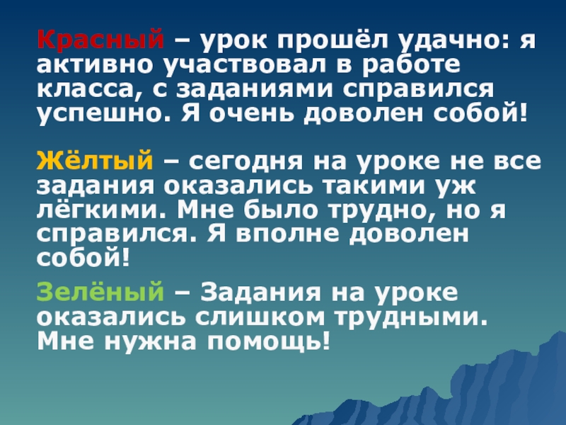 Жёлтый – сегодня на уроке не все задания оказались такими уж лёгкими. Мне было трудно, но я справился. Я вполне доволен собой!