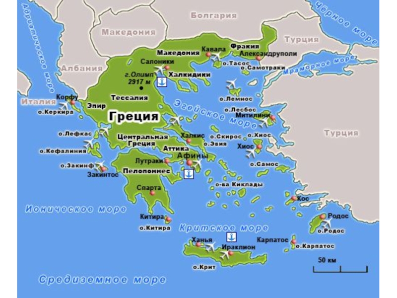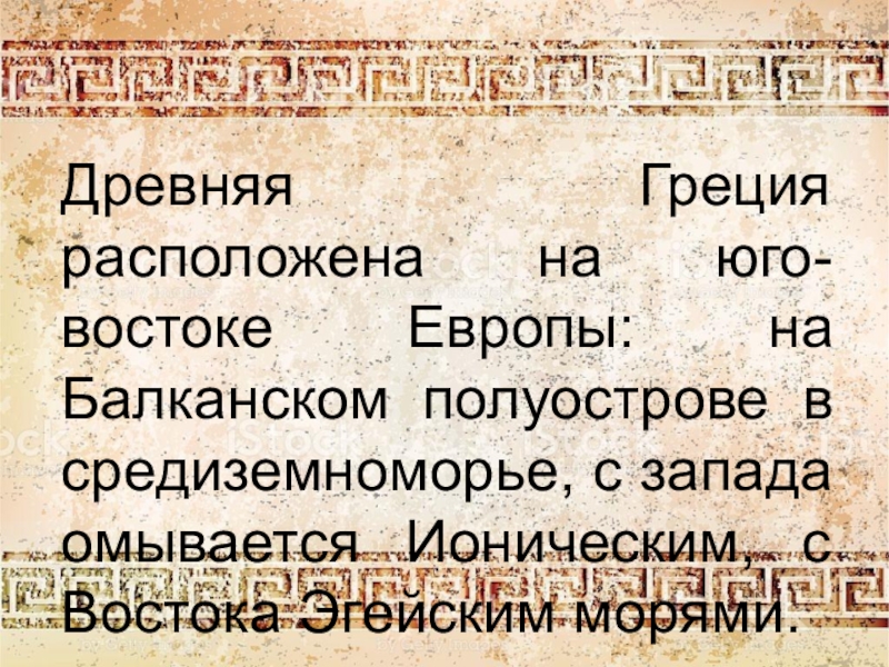 Древняя Греция расположена на юго-востоке Европы: на Балканском полуострове в средиземноморье, с запада омывается Ионическим, с Востока